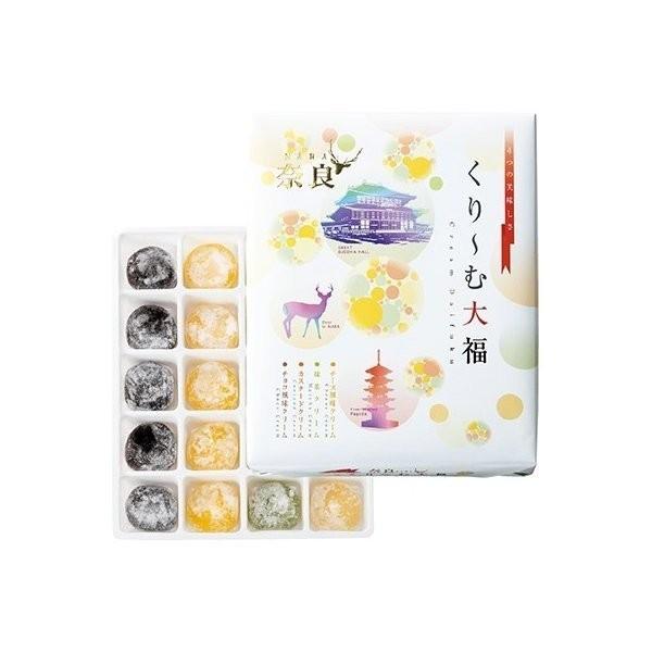 奈良くりーむ大福は、もっちりとした生地の中にチーズ風味や抹茶味、カスタード味、チョコ風味のクリームが入っているお菓子です。小さめのサイズで柔らかい生地なので幅広い世代のお土産に適しています。4種類の味が5個ずつ、合計20個入りとなっており、ご家族で分け合ったり、友人へのおすそわけにもぴったりです。パッケージには奈良県を象徴する観光名所や鹿のイラストがあしらわれており、思わず手に取りたくなるような明るいデザインとなっています。色んな味が詰め合わせで入っているので相手の好みが分からないというときにも安心して贈ることができますよ。