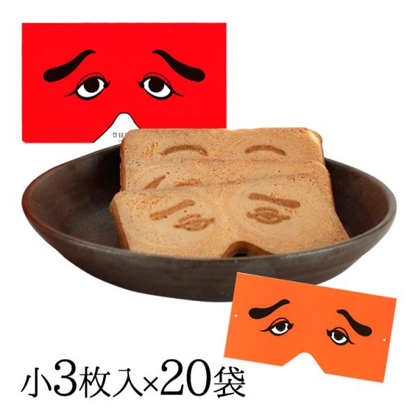 『二〇加煎餅(にわかせんべい)』は、”二〇加”と書いて”にわか”と読む、博多の郷土芸能”博多仁和加”の半面を形どった煎餅です。箱には、たれ目と眉毛をあしらったイラストが描かれているのが特徴的。そのパッケージのイラストが、そのまま煎餅にも刻印されています。