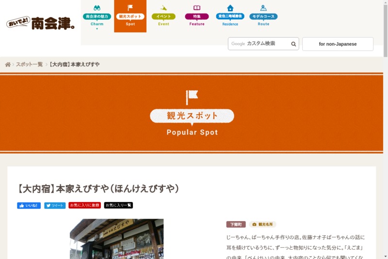 ホーム北海道/東北のショップ福島県のショップ南会津郡下郷町のショップ 本家えびすや 2021年1月5日 SHARE ポスト シェア はてブ LINE 店舗名 本家えびすや 住所 〒969-5207 福島県南会津郡下郷町大内山本10 電話番号 0241-68-2922 ホームページ http://www.aizu-concierge.com/spot/3421/ 営業時間 –