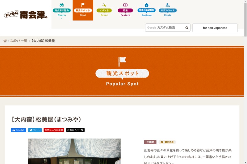 ホーム北海道/東北のショップ福島県のショップ南会津郡下郷町のショップ 松美屋 2021年1月5日 SHARE ポスト シェア はてブ LINE 店舗名 松美屋 住所 〒969-5207 福島県南会津郡下郷町大内山本29番地 電話番号 0241-68-2937 ホームページ http://www.aizu-concierge.com/spot/3407/ 営業時間 –