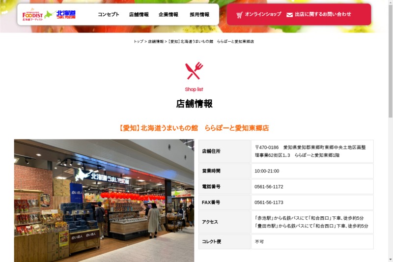 | 店舗名 | 北海道うまいもの館 ららぽーと愛知東郷店 |