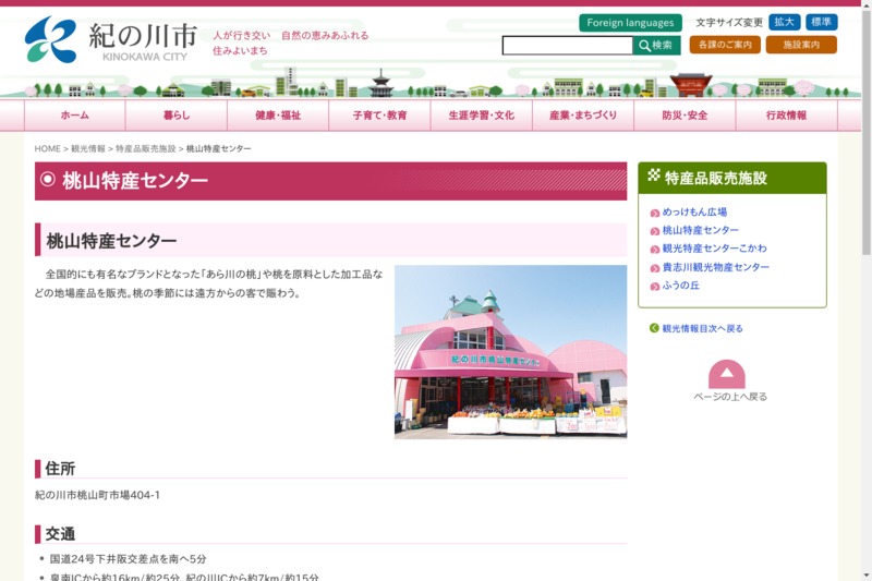 ホームページ http://www.city.kinokawa.lg.jp/kanko/tokusan/momoyamatokusannsennta.html