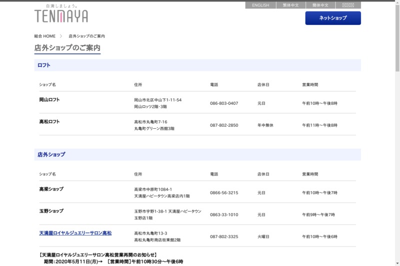 ホームページ https://www.tenmaya.co.jp/satelliteshop.html