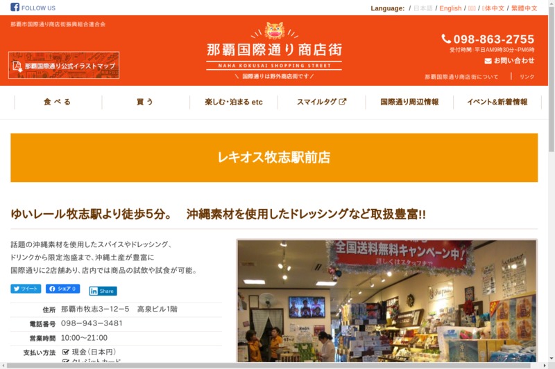 ホームページ https://naha-kokusaidori.okinawa/shops/%E3%83%AC%E3%82%AD%E3%82%AA%E3%82%B9%E7%89%A7%E5%BF%97%E9%A7%85%E5%89%8D%E5%BA%97